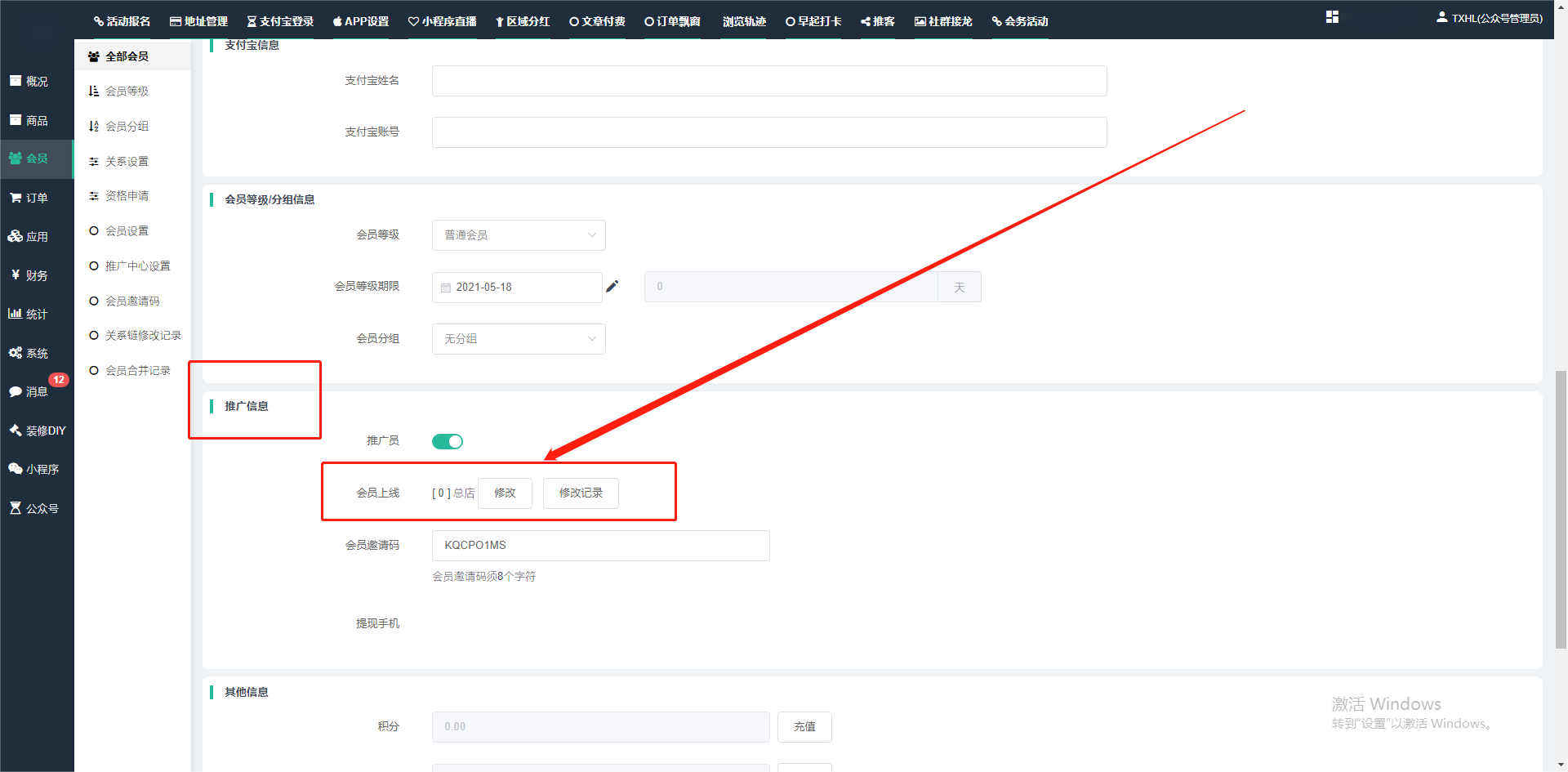 目录 搜索 展开 一、前期准备资料二、数字乡村码-上线操作指南1、服务号的申请流程及认证2、申请小程序流程3、开放平台绑定小程序和公众号三、数字乡村码-系统操作数字乡村码系统管理-概况数字乡村码-商品管理1、发布商品2、商品列表3、商品表单4、商品分类5、品牌管理6、配送模板7、评论管理8、优惠券管理9、商品标签10、退货地址设置11、满额优惠12、批量操作13、配送方式14、基础设置15、商品隐藏四、数字乡村码-会员管理1、全部会员2、会员等级3、会员分组4、资格申请5、会员设置6、推广中心设置7、会员邀请码8、会员关系链修改关系链修改记录9、会员合并记录10、账号注销管理11、会员设置中心五、数字乡村码-订单管理1、订单管理列表2、订单处理流程3、订单状态4、订单修改价格5、订单退款退货6、多包裹发货7、批量发货订单操作步骤8、催发货订单9、物流查询六、数字乡村码-财务管理1、余额设置2、会员余额3、充值记录4、转让记录5、余额明细6、收入明细7、提现设置8、提现统计9、积分管理10、转账审核11、收益广告12、批量充值七、数字乡村码-系统管理1、商城入口2、商城设置①、商城设置②、订单设置③、物流查询④、短信⑤、联系方式⑥、分类⑦、优惠券⑧、分享⑨、幻灯片⑩、广告位⑫、地图设置3、交易设置4、微信模板消息自定义消息模板(新版)自定义消息模板(旧版)小程序消息模板公众号模板消息变更公告5、语言设置6、权限管理7、多媒体管理八、数字乡村码-消息管理九、数字乡村码-应用管理十、数字乡村码系统-数据统计十一、数字乡村码-页面装修DIY1、模板管理2、店铺页面3、顶部导航4、底部导航5、DIY模板市场6、首屏广告7、基础设置8、装修DIY尺寸建议十二、供应商功能插件操作指南1、供应商2、门店-收银台门店申请和使用步骤门店管理①、门店-收银台 营销设置②、门店-收银台 分润设置门店分类门店申请门店审核门店商品门店商品订单收银台订单数据统计核销员基础设置默认设置门店装修3、微社区4、会务活动十三、营销插件操作指南活动报名提货卡新人奖微店问卷调查积分视频分享1、视频分享基础设置2、视频分享发现管理3、视频分享分类管理4、视频分享评论管理5、视频分享分红记录6、视频分享短视频中心每日红包幸运大抽奖签到优惠券二维码任务奖励优惠劵文章音频文章付费文章限时购新海报拓客卡操作流程积分活动素材中心视频红包十四、入驻门店应用类1、门店预约2、附近商品3、门店定位设置4、门店控制5、门店满额包邮6、门店满额减7、导入商品8、门店搜索9、门店股东10、核销券11、多门店核销1、商城后台设置2、前端功能演示十五、常见问题1、后台登录密码修改流程2、会员-余额,积分,后台如何进行充值与扣除3、如何修改上下级关系4、一种万能的获取商城小程序路径的方法 暂无相关搜索结果! 阅读次数:1462 本文档使用 模王系统 发布 3、如何修改上下级关系 如何修改上下级关系一.如何修改上下级关系?1.会员-全部会员-可以通过搜索用户的独立ID,或者用户微信昵称,找到此会员,然后点击右边的(操作)2.再点击会员详情。3.滑到下面,有个推广信息-会员上线,点击修改4.输入上级的ID号,点击搜索,出来此上级会员后点击选择。5.滑到最下面,一定要点击提交按钮。文档更新时间: 2024-01-05 14:50 作者:链上旅行